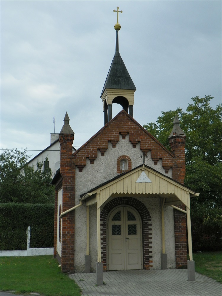 Elewacja frontowa chyba należy do najbardziej zdobionych spośród pozostałych, jednak są to zdobienia skromne. Otwór drzwiowy został zakończony półokrągłym łukiem, w którym to osadzono dwuskrzydłową stolarkę drzwiową, niemal całą pełną, z przeszkleniem w górnej jej partii, przez które nie można dojrzeć, co znajduje się we wnętrzu kapliczki... Powyżej otworu drzwiowego zamontowano daszek, zapewne chroniący mieszkańców od opadów atmosferycznych w czasie ostatniego pożegnania jednego z mieszkańców wsi, gdyż dziś kapliczka pełni funkcję kaplicy pogrzebowej.