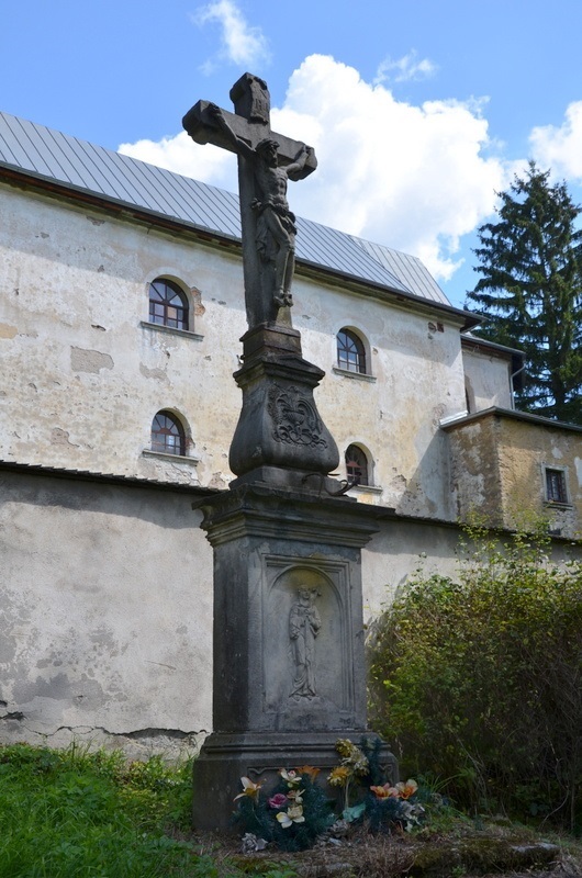 Kamienna Boża Męka stoi po zewnętrznej stronie muru otaczającego teren kościoła Nawiedzenia Najświętszej Marii Panny i cmentarza przykościelnego. Krzyż z figurą ukrzyżowanego Chrystusa stoi na małym ozdobionym motywami roślinnymi cokole ustawionym na głowicy dwustopniowego cokołu. Pierwszy stopień cokołu zawiera płycinę z nieczytelna inskrypcją, natomiast w drugim znacznie większej części w półokrągło zwieńczonej płycinie znajduje się płaskorzeźba przedstawiająca Matkę Bożą stojącą na kuli ziemskiej i piersią przebitej mieczem.
