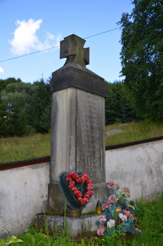 Na dwustopniowej podstawie pomnika stoi płyta z wyrytymi nazwiskami poległych. Powyżej na prostokątnej płycie napis w języku niemieckim "Im Weltkriege 1914/18 starben Heldentod furs Vaterland" informujący, że w wojnie światowej 1914/18 zginęli bohatersko za ojczyznę.