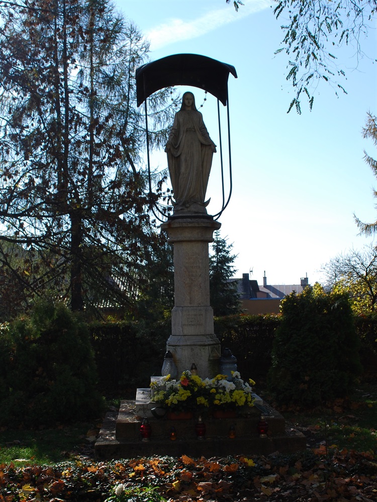 Sądząc po inskrypcjach, figura pochodzi prawdopodobnie z początku XX wieku a jej fundatorami byli Teofil i Teofila Piechowiczowie. Oprócz nazwiska fundatorów na cokole umieszczono napis, który jest już nadgryziony zębem czasu i najprawdopodobniej ma postać: "ROK 1820 1 STYCZNIA ROK 1902 1 STYCZNIA MATKO NIE OPUSZCZAJ NAS". Trudno jednak stwierdzić czego dotyczą daty. Figura znajduje się na terenie Bazyliki pw. św. Andrzeja przy ul. Szpitalnej 1.