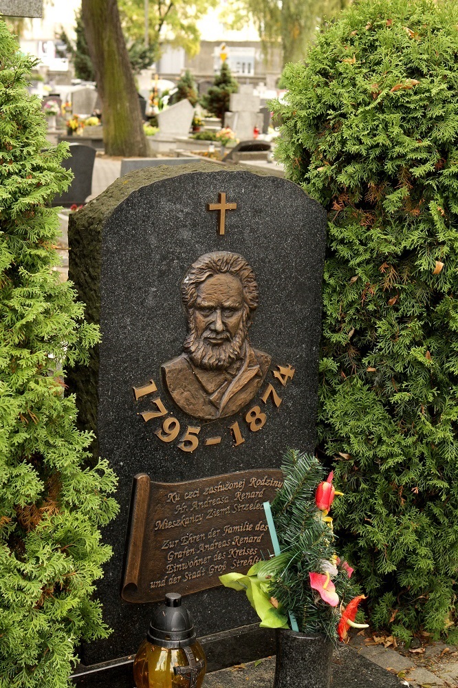Na cmentarzu parafialnym w Strzelcach Opolskich stoi pomnik upamiętniający hrabiego Andreasa Renarda. Andreas Maria Graf von Renard żył w latach 1795 - 1874. Hrabia był twórcą nowoczesnego przemysłu wprowadzającym najnowsze technologie, szanowanym włodarzem miasta Strzelce Opolskie, dobrym gospodarzem. Na pomniku widnieje płaskorzeźba hrabiego, data urodzenia i śmierci oraz tablica pamiątkowa z napisem w języku polskim i niemieckim: "Ku czci zasłużonej Rodziny Hr. Andreasa Renard - Mieszkańcy Ziemi Strzeleckiej".