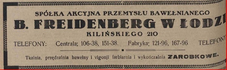 Założona przez Bera Freidenberga fabryka w roku 1892 posiadała przędzalnię, tkalnię, farbiarnię, drapalnię i bielnik. Fabrykant zatrudniał 600 robotników. Zakład znajdował się przy ulicy Widzewskiej 192 (obecnie ul. Kilińskiego 210). Od 1921 r. jako Spółka Akcyjna Przemysłu Bawełnianego - B. Freidenberg. W jej zarządzie, mającego siedzibę przy ul. Piotrkowskiej 104 zasiadali: Ber Freidenberg, Estera Windsbergowa, Herman Freidenberg. Dyrekcja - Tadeusz i Aleksander Freidenberg. Wówczas kapitał spółki wynosił 728 tys. zł.