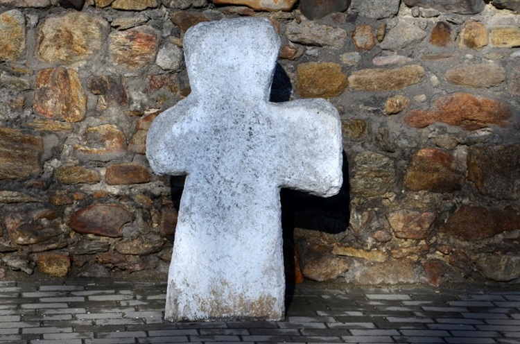 Kamienny krzyż stoi przy murze kościelnym przed bramą prowadzącą na teren kościoła św. Jerzego. Został wykonany przez sprawcę zbrodni na początku XV wieku. Krzyż wykuty został w granicie, jest wysoki na 136 cm, rozpiętość ramion wynosi 80 cm, a jego grubość wynosi 12 cm. Niestety, krzyż został pomalowany na biało przez co dużo stracił ze swojego ładnego wyglądu.