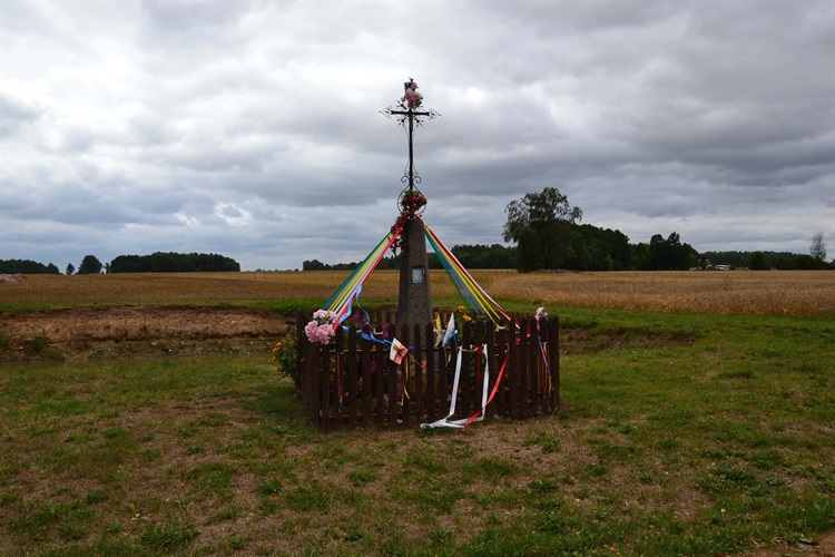 Grochy Serwatki to niewielka, licząca 10 domostw wieś w gminie Gzy w powiecie pułtuskim. Znajduje się pomiędzy trasą krajową nr 618 a drogą gminną Gzy - Ostaszewo Wielkie. Pamiątką po dawnych jej folwarcznych czasach jest droga żwirowa wysadzona po obu stronach starymi wierzbami. Wystawiony w 1906 roku krzyż (data wyryta w cokole) osadzony jest w kamiennym, dwustopniowym, zwężającym się ku górze postumencie. W niewielkiej prostokątnej wnęczce umieszczony został wizerunek Matki Bożej Licheńskiej. Wokół krzyża rosną kwiaty. Ogrodzony jest on drewnianym płotem.