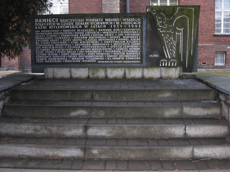 Przed budynkiem Gimnazjum znajduje się tablica zawierająca 44 nazwiska rozstrzelanych nauczycieli. Wśród nich wymieniony jest Teofil Naczk - był on woźnym i udzielał w szkole schronienia uczniom konspirującym oraz organizował w niej schowki na materiały "zakazane".