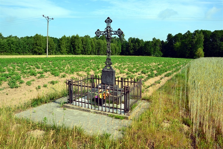 Ten stojący w polu kilka metrów od szosy, osadzony na betonowym, prostokątnym słupku krzyż, otoczony jest metalowym ogrodzeniem. W zejściu ramion umieszczono płaskorzeźbioną figurkę nie jak to zwykle bywa Pana Jezusa Ukrzyżowanego, ale przedstawiającą postać kobiecą z dłońmi ułożonymi do modlitwy. Jest to prawdopodobnie Najświętsza Maryja Panna, aczkolwiek ze względu na brak jakiegokolwiek wpisu, całkowitej pewności mieć nie można. Brak również daty wystawienia.