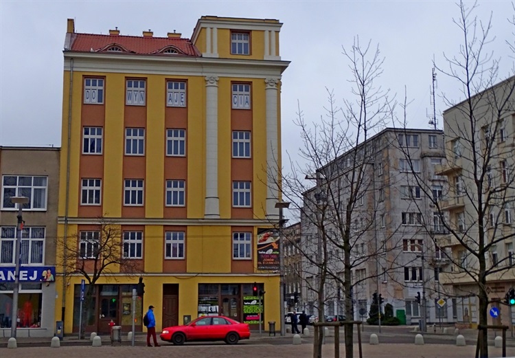 Wytarty do białości palec mężczyzny wskazuje pobliski narożny budynek z charakterystycznym wystającym ponad dach narożnikiem. To kamienica Jakuba Scheibe, swego czasu nazywana gdyńskim drapaczem chmur. W 1928 r. świeżo zbudowany, czteropiętrowy budynek z „nadstawką” na wysokości kolejnego piętra, musiał robić wrażenie.