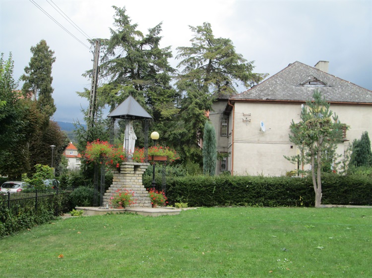 Figura Matki Bożej znajduje się w ogrodzie przy kościele p.w. Miłosierdzia Bożego. Biała figura umieszczona jest na murowanym z cegieł cokole. Nad nią znajduje się czterospadowy, metalowy daszek.