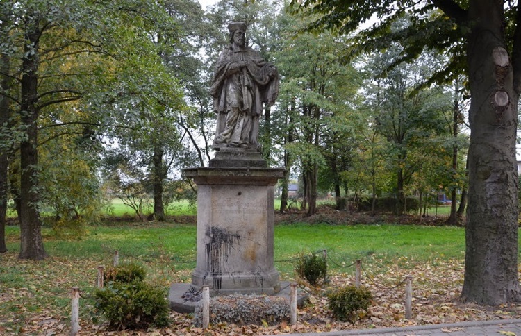 Kamienna figura św. Jana Nepomucena znajduje się na skraju drogi Prudnik – Głuchołazy i naprzeciwko ruin zamku wzniesionego w XV wieku. Od XVI wieku do 1825 roku zamek jak i majątek należał do rodu Mettich. Stojąca naprzeciw zamku figura została ufundowana w 1712 r. przez jednego z członków tego rodu, o czym można dowiedzieć się ze słabo czytelnego chronostychu wyrytego na postumencie.