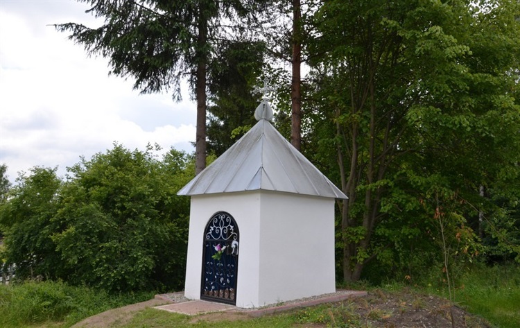 Druga kapliczka usytuowana jest na końcu wsi i jest podobna do pierwszej. Zbudowana jest na planie kwadratu,murowana, otynkowana oraz nakryta czterospadowym dachem zwieńczonym krzyżem. Wejście do kapliczki zwieńczone łukiem i zabezpieczone drzwiami wykonanymi z drewnianych stylizowanych szczebli. Wewnątrz na przyściennym ołtarzu stoi figura Matki Bożej, a na ścianach wiszą obrazy z wizerunkami świętych.