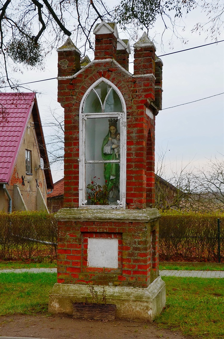 Kapliczka została wzniesiona z czerwonej cegły licowej na planie kwadratu. Otaczają ją cztery wiekowe lipy z historycznego nasadzenia. Jest to budowla dwukondygnacyjna z rozbudowaną i dekoracyjną partią dachu najeżonego sterczynami. Jej front zdobi duża ostrołukowa wnęka z metalową okiennicą. Wewnątrz niszy zachowało się jeszcze oryginalne wyposażenie. Jest to figura Matki Boskiej z Dzieciątkiem z napisem na cokole w języku niemieckim: "O Maria bitte für Uns".