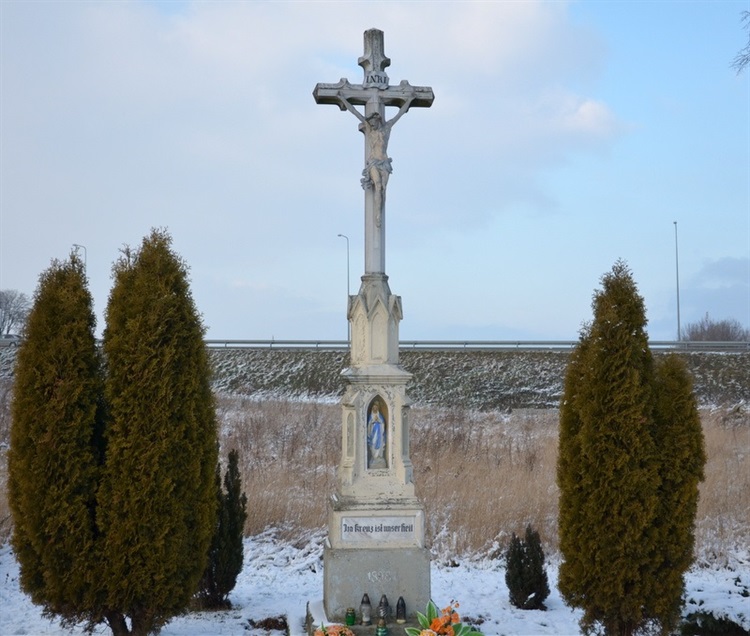 Kamienny krzyż usytuowany jest w pobliżu kapliczki „Napoleońskiej”. Został wzniesiony w 1898 roku, gdyż taka data wyryta jest na ścianie frontowej podstawy. Na prostej prostokątnej podstawie stoi ładny kilkuczęściowy ozdobny cokół, na którym inskrypcje wyryte są w języku niemieckim. Na ścianie frontowej w zamkniętym ostrym łukiem wnęce umieszczona jest figurka Matki Bożej Różańcowej. Ozdobny krzyż o ściętych bokach stoi na stopce wieńczącej cokół. Na krzyżu postać ukrzyżowanego Jezusa Chrystusa z rozciętym prawym bokiem i koroną cierniową na głowie. Powyżej głowy pionowy pofalowany titulus z literami I.N.R.I.