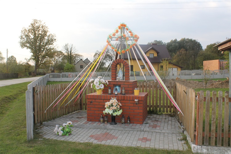 Murowana kapliczka z metalowym krzyżem i wybrukowanym otoczeniem. Figurka Matki Boskiej i obrazek Jezusa.