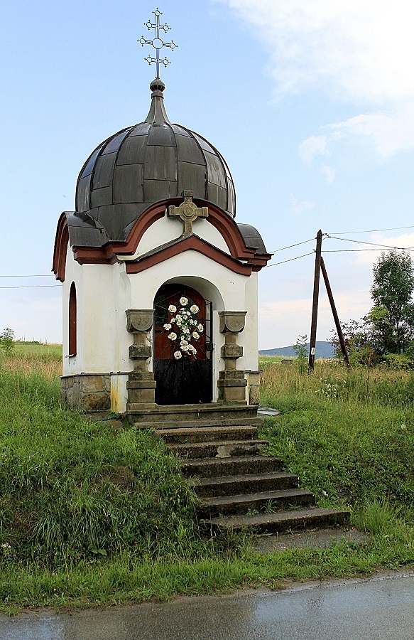 Kapliczka przydrożna w Męcinie Wielkiej wzniesiona została na planie krzyża greckiego. Obiekt jest murowany, otynkowany. Dach w kształcie kopuły, pokryty blachą, zwieńczony krzyżem. Do łemkowskiej kapliczki prowadzą kamienne schodki. Wejście ozdabiają dwie niewysokie półkolumny oraz krzyż równoramienny usytuowany na daszku. Wewnątrz znajduje się ołtarz z obrazem Matki Bożej, obraz Serca Jezusowego i Serca Maryi.