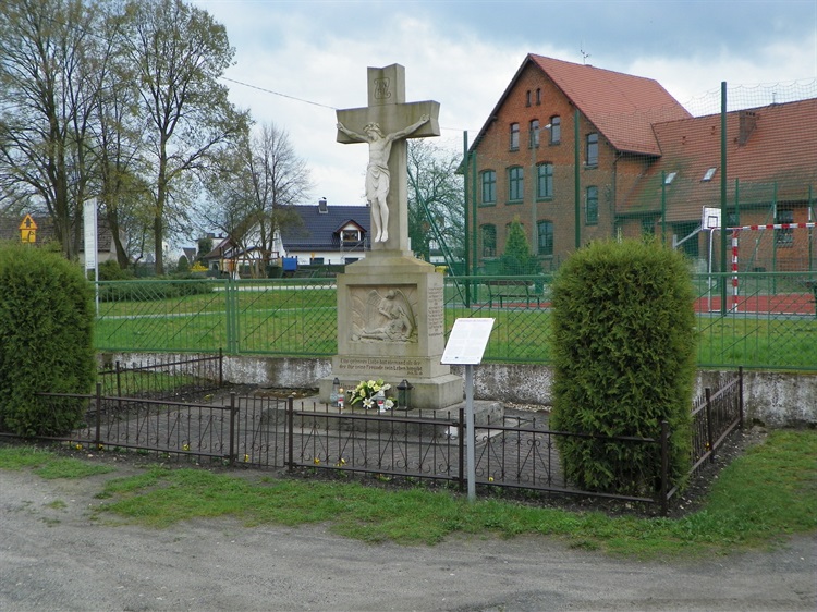 Krzyż jest dość masywny, stoi na wysokim cokole, w którym od frontu widać relief (płaskorzeźbę) przedstawiający anioła (może anioła śmierci...) pochylonego nad umierającym żołnierzem. Pod reliefem, na płycie postumentu widoczny jest napis, który po roku 1945 został zatynkowany (na szczęście nie skuty, bo to cytat z Biblii, z Nowego Testamentu, Ewangelii św. Jana) - by pod osłoną nocy w latach 80. XX wieku znów ujrzeć światło dzienne w wersji niemieckiej: “Eine Grosse Liebe hat niemand als der der für seine Freunde sein Leben hingibt" ( J. 15,13 ), co można przetłumaczyć: "Nie ma większej miłości, niż oddać życie za przyjaciół swoich".