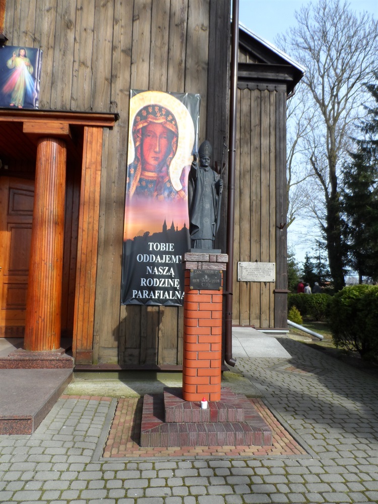 Po prawej stronie od wejścia do kościoła pw. św. Mikołaja znajduje się pomnik Jana Pawła II. Przedstawia on postać papieża, który znajduje jest na wysokim, murowanym z cegły klinkierowej cokole