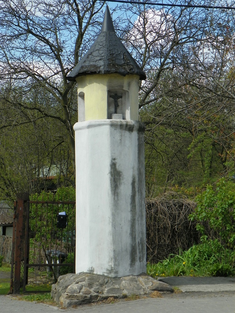 Od frontu, w bruździe znajduje się stary krzyżyk z Ukrzyżowanym, osadzony na małym postumenciku. Pierwotnie w niej znajdowała się figura Matki Bożej Bolesnej z rzeźbą Chrystusa Upadającego pod Krzyżem. Nie wiadomo, co się z nimi stało...