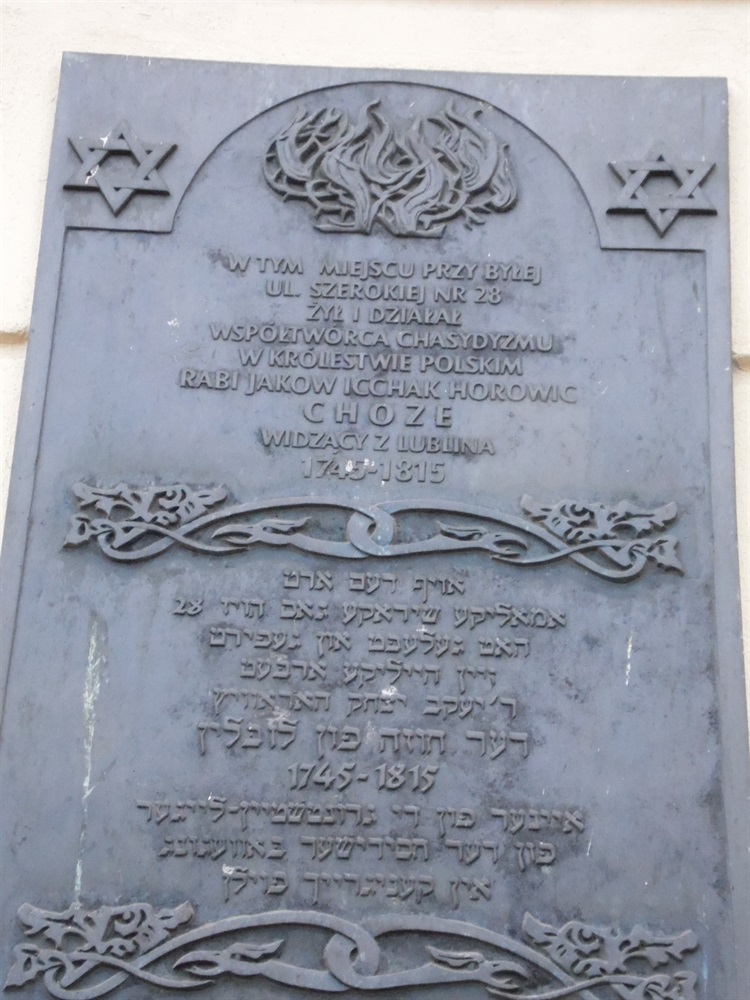 Po prawej stronie Placu Zamkowego, od strony alei znajduje się tablica informująca nas, że tu przy nieistniejącej już ulicy Szerokiej 28, na terenie zlikwidowanej podczas wojny przez hitlerowców dzielnicy żydowskiej mieszkał Jaakow Icchaak Ha-Lewi Horowic (1745-1815) - słynny Cadyk, współtwórca Chasydyzmu z Królestwie Polskim. Był zwany Widzącym z Lublina ze względu na dar jasnowidzenia. Jego grób znajdujący się na starym kirkucie odwiedzają Żydzi z całego świata do dziś.