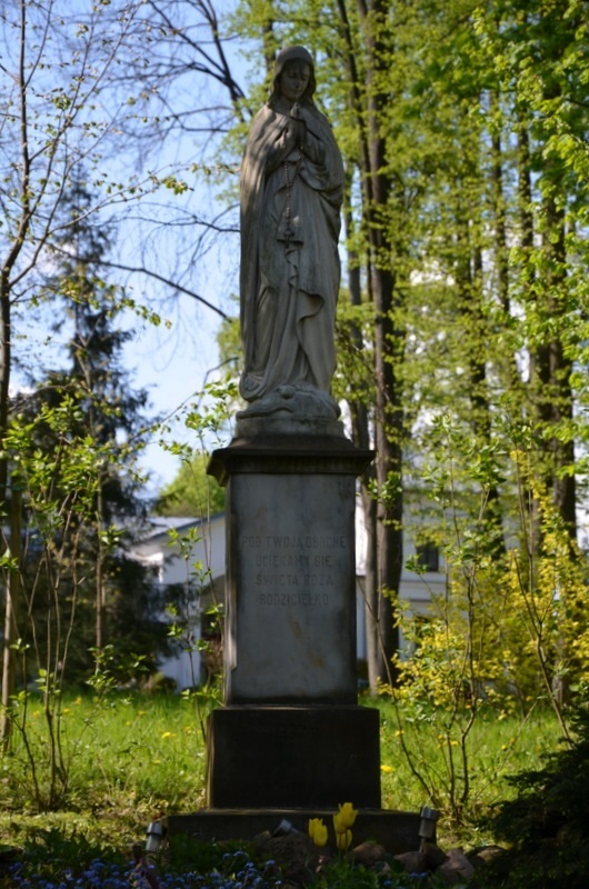 Kamienna figura Matki Bożej stoi na skraju pałacowego parku krajobrazowego. Wieńczy dwustopniowy cokół posadowiony na kwadratowej podstawie. Kamienna rzeźba przedstawia Matkę Bożą Niepokalanego Poczęcia ze stojącą na kuli ziemskiej ze złożonymi do modlitwy rękami i depczącą piekielnego węża. Na ścianach frontowych cokołu wyryty jest rok powstania kapliczki: 1937 oraz napis: POD TWOJĄ OBRONĘ UCIEKAMY SIĘ ŚWIĘTA BOŻA RODZICIELKO. Kapliczkę ufundował ówczesny właściciel majątku w Kęble inż. Paweł Janiszewski wraz z żoną Zofią.