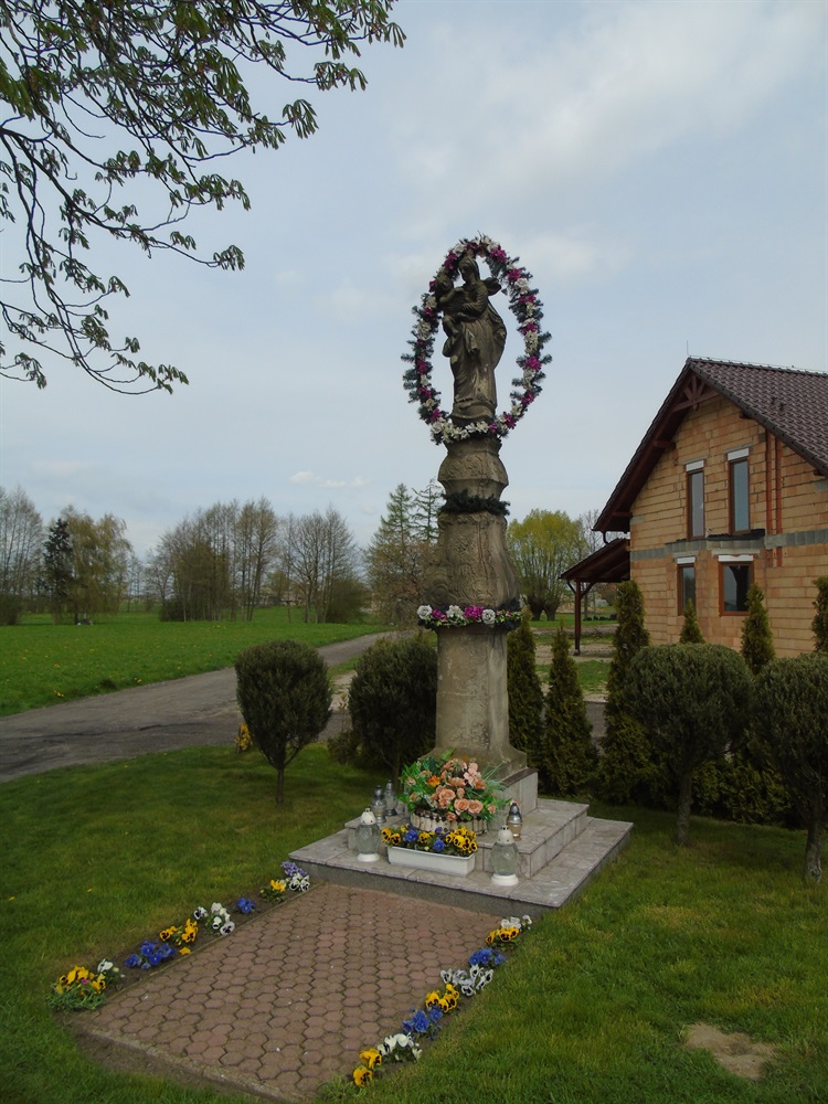 Barokowa rzeźba pochodzi z pierwszej połowy XVIII wieku o czym świadczy widoczna na cokole data 24 maja 1735 r. Postument pokryty jest płaskorzeźbami, a w części frontowej widoczna jest postać księdza trzymającego w ręku kromkę chleba. Owym kapłanem jest patron miłosierdzia św. Wincenty.