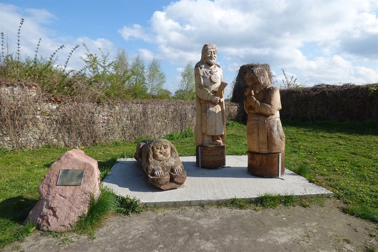 Spacerując po terenie Pomnika Historii jakim jest zespół Opactwa Cystersów w Sulejowie na Podklasztorzu, każdy zapewne trafi na pomnik. Przedstawia on trzy rzeźby postaci ściśle związanych z historią tego miejsca oraz legendami: księcia Kazimierza II Sprawiedliwego, Opata oraz lwa. Obok pomnika znajduje się niewielki głaz z pamiątkową tablicą.