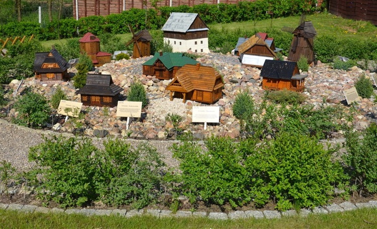 W parku ustawiono kilkadziesiąt miniatur obiektów architektury drewnianej wykonanych w skali 1:25. Obiekty prezentowane w parku zlokalizowane są na terenach położonych pomiędzy Kazimierzem Dolnym, Puławami i Nałęczowem. Podziwiać tu możemy między innymi: wille z Nałęczowa, chaty Męćmierza, młyny położone nad rzeką Bystrą, obiekty Kazimierza Dolnego, zabytki kultury żydowskiej, kościoły, wojciechowską kuźnię, dworzec w Sardukach czy wiejskie chałupy. Oglądając poszczególne obiekty możemy poznać ich budowę i historię, gdyż poszczególne obiekty są opisane.