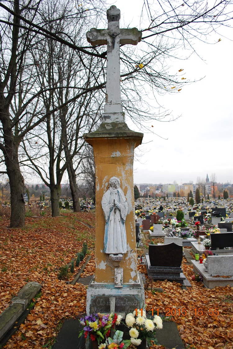 Krzyż wygląda na dość stary, niestety napis z ewentualną datą na cokole w znacznym stopniu zakryty kwiatami. Krzyż znajduje się przy ogrodzeniu na terenie cmentarza przy ul. Pszczelnej od strony ul. Chorzowskiej.