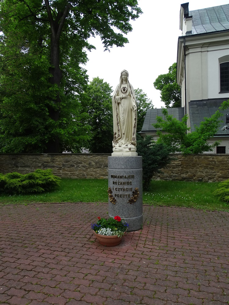 Na placu Św. Jana Duklana przy murze kościoła św. Marii Magdaleny znajduje się figura Matki Bożej Różańcowej, która została umieszczona na marmurowej kolumnie. Na kolumnie zostały umieszczony napis odlanych z brązu liter: „Odmawiajcie różaniec i czyńcie pokutę”, a pod nim znajdują się dwie gałązki róży