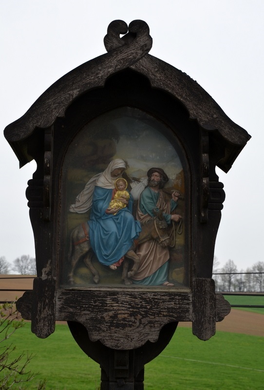 Wewnątrz kapliczki wstawiony jest obraz przedstawiający Świętą Rodzinę w podróży. Matka Boska z dzieciątkiem Jezus jedzie na ośle prowadzonym przez św. Józefa.