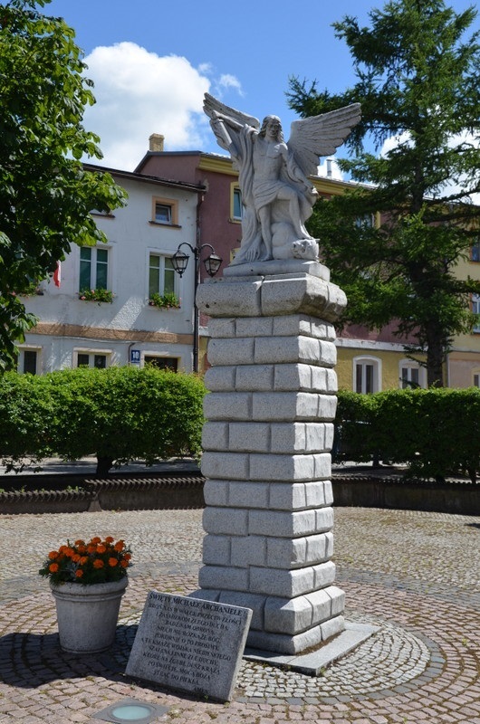 Figura św. Michała Archanioła stoi na placu obok XVI-to wiecznego kościoła. Strażnik Królestwa Niebieskiego jest bowiem patronem tutejszego kościoła. Scena figuralna, w której Michał Archanioł pokonuje Lucyfera wieńczy prostokątny wysoki postument wykonany z bloczków kamiennych. Michał Archanioł przedstawiany zazwyczaj w zbroi, w tym przypadku ma jedynie pas materiału na biodrach. Figura z rozpostartymi skrzydłami, uniesioną prawą ręką z mieczem, lewą nogą przyciska do podłoża głowę leżącego diabła. U podnóża postumentu postawiona jest kamienna tablica z modlitwą do św. Michała Archanioła.