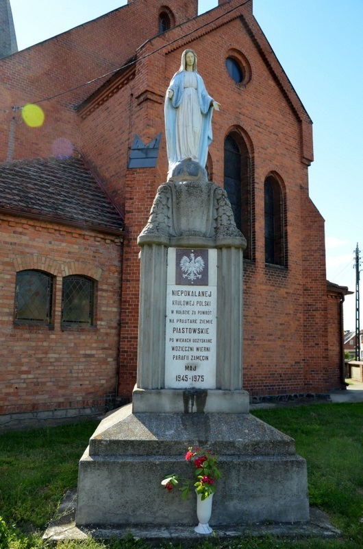 Tablica pierwsza przytwierdzona w 1975 roku zawiera napis „ NIEPOKALANEJ KRÓLOWEJ POLSKI W HOŁDZIE ZA POWRÓT NA PRASTARE ZIEMIE PIASTOWSKIE PO WIEKACH ODZYSKANE. WDZIĘCZNI WIERNI PARAFII ZAMĘCIN. MAJ 1945 – 1975”. Druga tablica przymocowana zapewne po transformacji ustrojowej, zawiera wizerunek orła w koronie.
