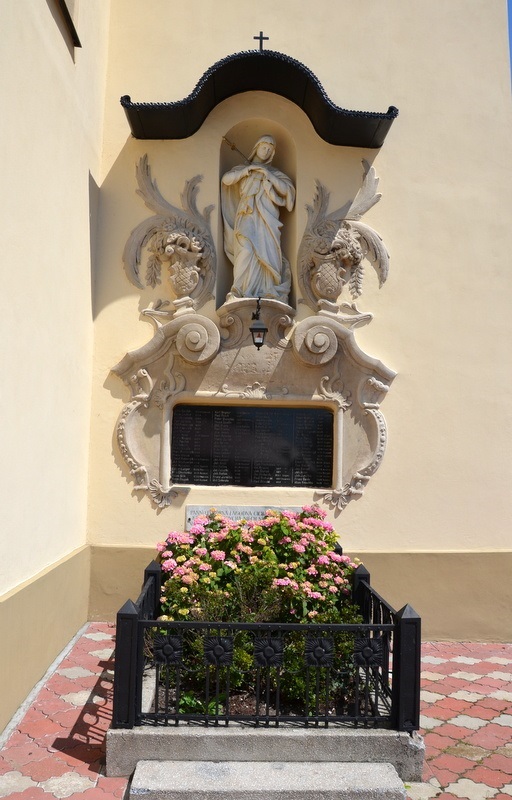 Pod figurą wmurowana jest tablica z nazwiskami, datami oraz miejscowościami gdzie polegli. Poniżej na podłużnej płycie umieszczony jest napis o treści „PANNO POKORNA, ŁAGODNA, CICHA NIECHAJ POKOJEM KRAJ NASZ ODDYCHA, NIECH SIĘ NIEZGODA W NAS NIE ROZWIJA, BROŃ NAS OD WOJEN, ZDROWAŚ MARYJA”.