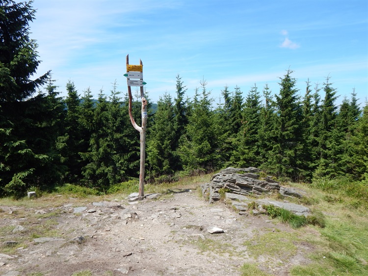 Sam szczyt to kilka gnejsowych skałek i słupek z informacją. Nie ma tu zbyt dobrego punktu widokowego, drzewa dość skutecznie ograniczają widoczność.