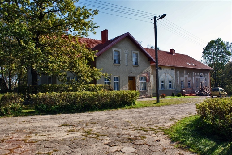 Późnoklasycystyczny dwór (XIX w., 1908 rozbudowany w stylu secesyjnym). Fragment parku krajobrazowego. Dworskie zabudowania gospodarcze.