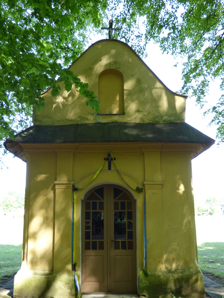 Kapliczka jest budowlą murowaną, otynkowaną, zakończoną półokrągłą ścianką, tworzącą tzw. absydkę, przekrytą dachem dwupołaciowym, załamanym nad absydką. Daszek pokryty został arkuszami blachy ocynkowanej. W ścianie frontowej w znajdującym się otworze wejściowym, osadzono dwuskrzydłową stolarkę drzwiową przeszkloną mniej więcej w połowie. I chyba jest to nawet oryginalny element tej małej budowli. Otwór zwieńczono półokrągłym łukiem nad którym dodatkowo symetrycznie umieszczono zdobienie w formie cienkiej opaski będącej „powtórzeniem” wspomnianego łuku. Po bokach, od (przypuszczam) kamiennego, otynkowanego cokolika, wychodzą ryzality jakby podtrzymujące fragment daszku, zbliżonego do tzw. półszczytowego lub przyzbowego, nad gzymsem kordonowym otaczającym budowlę pod okapem. Nad gzymsem przekrytym wspomnianym daszkiem, widoczna jest ścianka szczytowa z pustą bruzdą na figurkę. Boki ścianki zakończono zaokrągleniem, może trochę nawiązującym do stylu barokowego lub neobarokowego, a od przodu na ściance umieszczono mały krzyżyk.