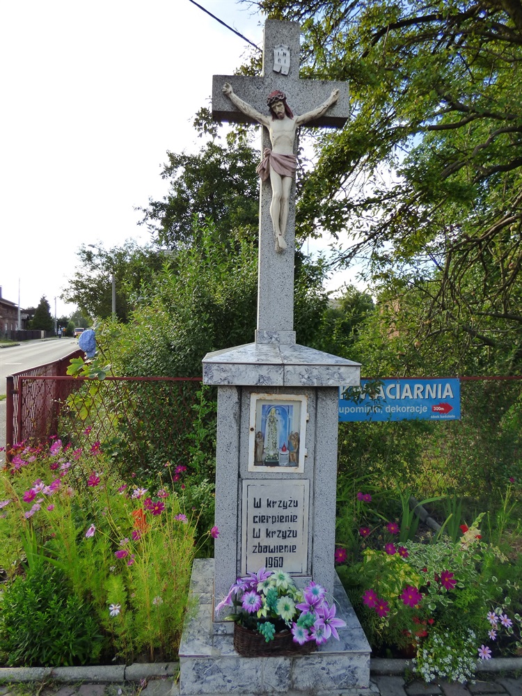 Na styku ulic Św. Maksymiliana Kolbego z Kuźnicką stoi skromny, niewysoki krzyż, wykonany z lastryka. Jest to pomnik poświęcony pamięci pomordowanych w okolicach podczas „Marszu Śmierci” (ponad 30. więźniów z ewakuowanego w styczniu 1945 roku obozu KL Auschwitz). Na miejscu ich pochówku postawiono drewniany krzyż, który wiosną 1960 roku został złamany przez wichurę. Na płycie fundamentowej obłożonej płytkami, został postawiony postument wykonany z lastryka, w którym znajduje się płytka bruzda, a w niej figurka Matki Boskiej, za którą widoczny jest obrazek z Najświętszym Sercem Pana Jezusa. Bruzda jest zamykana małymi, przeszklonymi drzwiczkami. Pod wnęką znajduje się tablica z napisem „W krzyżu cierpienie W krzyżu zbawienie 1960”. Postument został zwieńczony czymś w rodzaju „czapy”, również obłożonej płytkami na którym został osadzony masywny krzyż, wobec Figury Ukrzyżowanego, która dziś wymaga odnowienia.