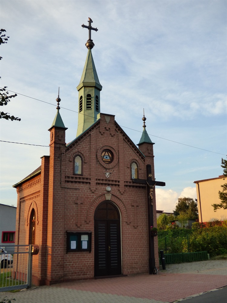 Kaplica jest murowana, nieotynkowana, zbudowana w stylu nawiązującym do neogotyku. Została przekryta dachem dwupołaciowym pokrytym współczesnym gontem. Na styku połaci osadzona została nieduża, strzelista wieżyczka na sygnaturkę, przekryta daszkiem wieżowym. Elewacja frontowa jest najbardziej zdobioną z wszystkich elewacji.