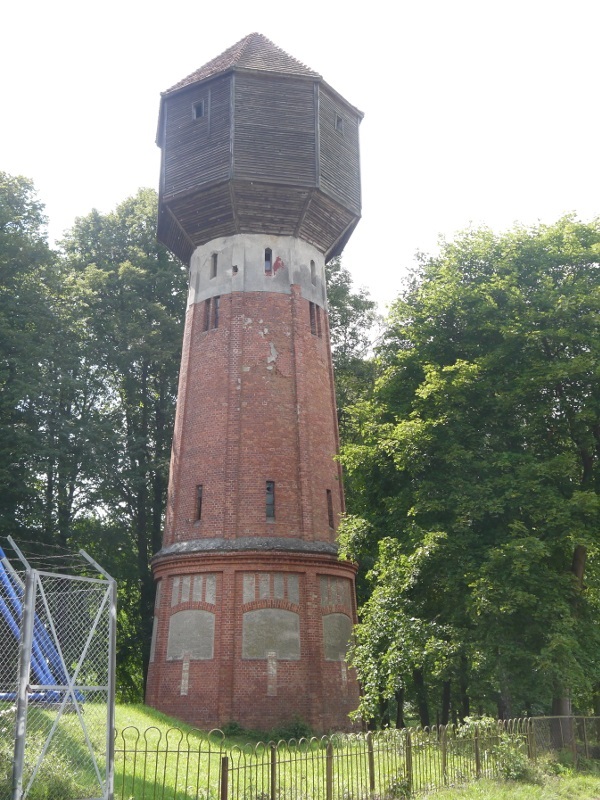 Konstrukcja pochodzi z 1908 r. Jest wysoka na ok. 30 m, murowana z cegły, trzon o przekroju koła, część zbiornikowa - ośmiokąta. Obudowa zbiornika jest drewniana, przykryta ceramicznym, ostrosłupowym dachem. Na zdjęciach przedwojennych drewnianej obudowy nie widać, powstała ona zapewne podczas naprawiania wojennych zniszczeń. Tuż obok wybudowano w 1993 r. nową wieżę, metalową i wyższą od starej. Obiekt znajduje się na terenie ujęcia wody; oglądać go można z odległości kilku metrów.