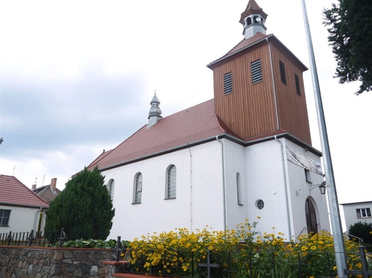 Świątynia jest murowana, na planie prostokąta, o odwróconej orientacji (ze względu na położenie względem drogi), nakryta dwuspadowym dachem. Nad głównym wejściem wznosi się wieża, w górnej części drewniana. Wystrój kościoła, z jednym wyjątkiem, pochodzi z czasu jego budowy: ołtarz główny z płaskorzeźbą Najświętszego Serca Jezusowego (dzieło profesora Zelke) i malowidła ścienne (Jana Brzozy z Gdańska). Boczny ołtarz Matki Boskiej Szkaplerznej pochodzi z poprzedniego kościoła.