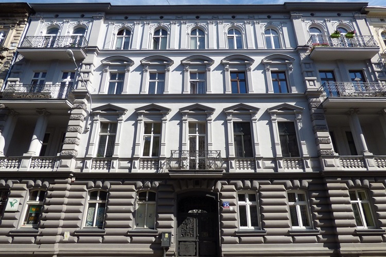 Choć na pierwszy rzut oka fasada kamienicy stojącej przy ul. Więckowskiego 25 (d. ul. Cegielniana 10) zasadniczo się różni od sąsiadującej z nią pod nr 23, to jednak posiadają one takie same wspólne elementy. Są nimi trzecie piętra, tak samo zdobione. Czyżby to tylko zbieg okoliczności podczas ich wznoszenia, a może architektom taki sposób zdobienia otworów okiennych podobał się najbardziej? Nic z tych rzeczy i wyjaśniam.