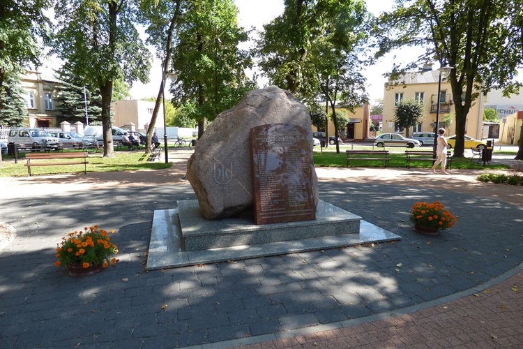 Bez mała w samym centrum północno-wschodniego skweru placu im. Tadeusza Kościuszki znajduje się potężny głaz z pamiątkową tablicą. Upamiętnia on "Mieszkańców Konstantynowa Łódzkiego Zamordowanych Podczas II Wojny Światowej W Katowniach Gestapo Niemieckich Obozach Koncentracyjnych I Zagłady Oraz Więzionych W Sowieckich Obozach W Kozielsku I Ostaszkowie Straconych W Katyniu i Twerze Oraz Innych Konstantynowian Nieznanych Z Nazwiska". Na tablicy widnieje 57 nazwisk osób, które straciły życie. Oprócz pamiątkowej tablicy na głazie znajduje się symbol Polski Walczącej oraz herb Ostoja, który to Konstantynów otrzymał od swojego założyciela Mikołaja Krzywca-Okołowicza.