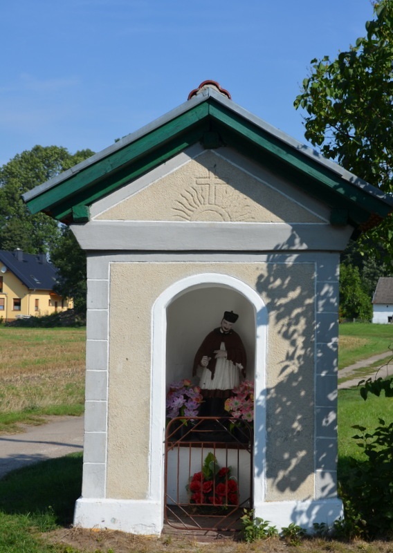 Na skraju wiejskiej drogi stoi murowana kapliczka. Jest to kapliczka typu domkowego, wzniesiona na planie prostokąta, murowana, otynkowana i nakryta dwuspadowym dachem krytym dachówką. Do wnętrza prowadzi półokrągło zwieńczone wejście zabezpieczone niską metalową kratą. Wewnątrz kapliczki na przyściennym ołtarzyku stoi wykonana z drzewna lipowego rzeźba św. Jana Nepomucena.