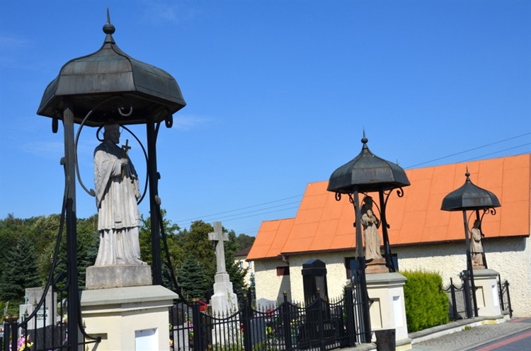 Pomiędzy ozdobnymi elementami metalowego ogrodzenia cmentarza przykościelnego znajdują się trzy proste postumenty z prostokątnymi płycinami. Na postumentach stoją kamienne figury świętych: Jana Nepomucena, Antoniego i Jana Sarkandra. Rzeźby osłonięte są metalowymi baniastymi daszkami. Św. Jan Nepomucen przedstawiony jest z aureolą nad głową nakrytą biretem, złotym krzyżem w prawej ręce i gałązką palmy w lewej, św. Antoni z dzieciątkiem na prawej ręce, a św. Jan Sarkander z długą stułą na szyi, z palcem przy ustach i księgą trzymaną w opuszczonej lewej ręce. Rzeźby pochodzą z XIX – XX wieku.