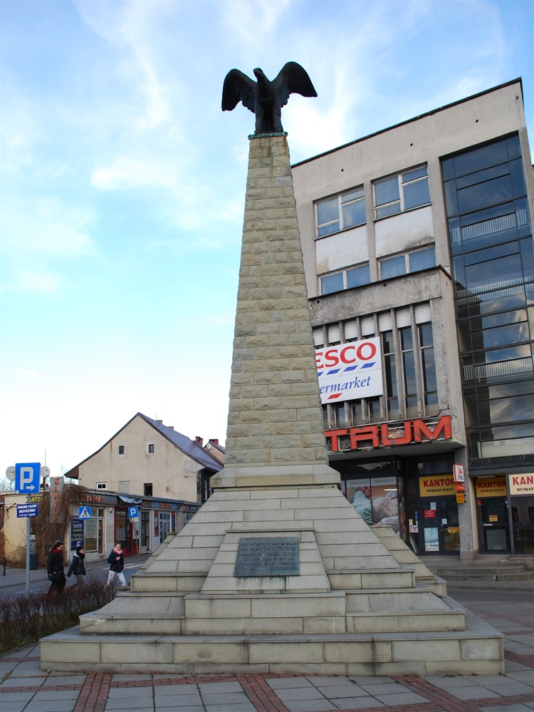 Pomnik wzniesiono 15 lipca 1910 roku z okazji 500-lecia zwycięskiej bitwy Polski i Litwy nad Krzyżakami. Pierwotnie był zlokalizowany przy wylocie Alei Wolności do ul. Kościuszki. W 1939 roku został zniszczony przez Niemców, zachowała się z niego jedynie tablica z napisem "W 500-ną rocznicę zwycięstwa pod Grunwaldem – Ziemia Żywiecka. Pomnik ten postawiono r.p. MCMX". Próby odbudowy pomnika rozpoczęto w 1985 roku, a odsłonięcie miało miejsce 11 listopada 2005 roku. Pomnik znajduje się na Placu Grunwaldzkim przy ul. T. Kościuszki.