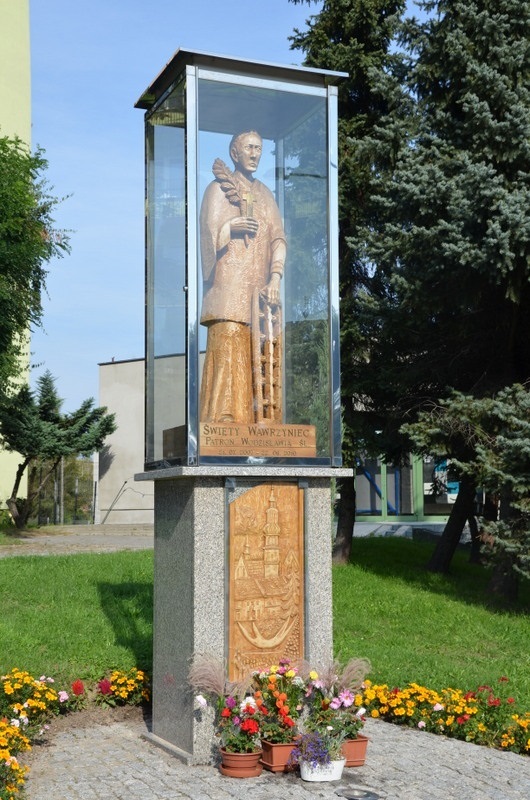 Figura św. Wawrzyńca, patrona miasta Wodzisława Śląskiego stoi na skraju ronda im. św. Wawrzyńca. Rzeźba przedstawiająca świętego jest nowa, została odsłonięta bowiem 22.06.2010 roku. Jednak już 10.08.1536 mieszkańcy Wodzisławia oddali się pod opiekę świętego, by poprzez jego wstawiennictwo odwrócić nieszczęścia jakie spadają na ich miasto. Nie wiadomo jakie to kataklizmy nawiedzały miasto. Być może był to pożar, powódź, a może epidemia. Niemniej jednak od tego roku rozpoczął się kult świętego Wawrzyńca.