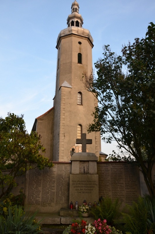 Pomnik poległych przylega do XVIII wiecznego muru otaczającego teren kościoła pw. Wniebowzięcia NMP. Pomnik posadowiony jest na betonowych płytach. Na postumencie pomnika wyryta jest inskrypcja w języku niemieckim informująca o przeznaczeniu pomnika. Powyżej w węższej części postumentu w prostokątnej płycinie umieszczony jest symbol militarny – bagnet z oplatającym go wieńcem. Postument zwieńczony jest gzymsem, na którym stoi krzyż. Do postumentu przylegają dwie tablice z wyrytymi nazwiskami i imionami poległych w latach 1914 – 1919.