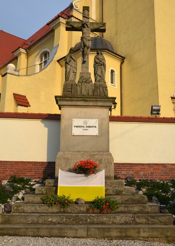 Grupa figuralna Boża Męka znajduje się przed murem okalającego teren kościoła pw. św. Jana Chrzciciela. Dwuczęściowy postument Ukrzyżowania posadowiony jest na sześciostopniowej podstawie. Wyższa, węższa część postumentu posiada prostokątną płycinę, w której umieszczona została tablica, na której umieszczony jest symbol Krzyża Żelaznego, a poniżej imię i nazwisko zapewne mieszkańca wioski Theofila Soboty, który stracił życie podczas I wojny światowej w 1915 r.