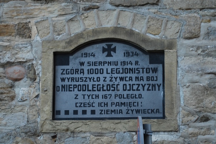 Na tablicy umieszczono daty 1914 i 1943, oraz napis: "W SIERPNIU 1914 R. Z GÓRĄ 100 LEGIONISTÓW WYRUSZYŁO Z ŻYWCA NA BÓJ O NIEPODLEGŁOŚĆ OJCZYZNY. Z TYCH 167 POLEGŁO CZEŚĆ ICH PAMIĘCI ! ZIEMIA ŻYWIECKA."