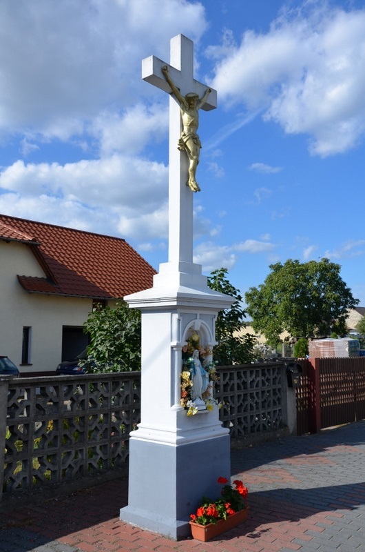 Kamienny krzyż stoi na chodniku przy ul. Strzeleckiej. Został wzniesiony w 1888 roku przez jednego z mieszkańców lub rodzinę zapewne w jakiejś intencji. Niestety kto go postawił i w jakiej intencji nie wiadomo. Co prawda na postumencie była w przeszłości wyryta inskrypcja, ale obecnie pozostało po niej niewiele. Niemal całą ścianę frontową cokołu zawiera zamknięta półkoliście wnęka dodatkowo ozdobiona po bokach półkolumnami. Wnęka wypełniona jest figurą Matki Boskiej Niepokalanie Poczętej stojącej na kuli ziemskiej i depczącej węża. Cokół zwieńczony jest gzymsem, na którym na dwustopniowej podstawie stoi prosty krzyż z figura ukrzyżowanego Chrystusa.
