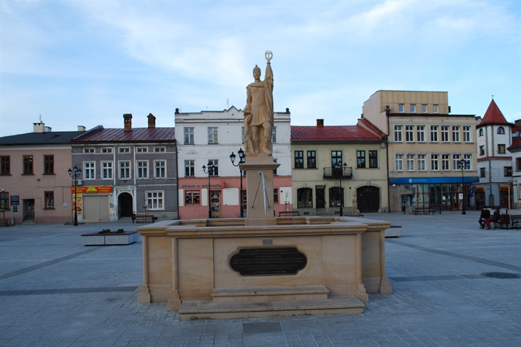Na kamiennym ocembrowaniu figury umieszczona jest tablica, która upamiętnia miejsce przysięgi wojskowej. W tym miejscu, w sierpniu 1914 r. 127 żołnierzy legionowych złożyło przysięgę, a następnie wyruszyło na front pod dowództwem Leonarda Rybarskiego. Na tablicy widnieje data 10 listopada 1988 roku. Figura oraz tablica znajdują się na środku rynku.